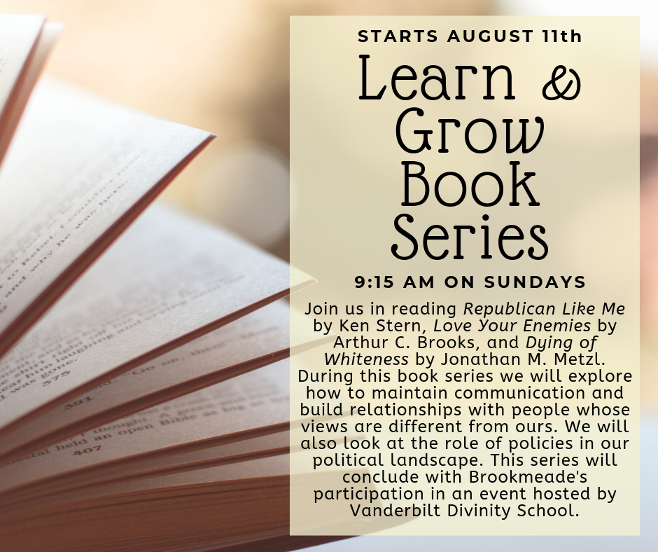 Learn & Grow classes will resume on Sunday, August 11th with a book series. Join us in reading Republican Like Me by Ken Stern, Love Your Enemies by Arthur C. Brooks, and Dying of Whiteness by Jonathan M. Metzl. During this book series we will explore how to maintain communication and build relationships with people whose views are different from ours. We will also look at the role of policies in our political landscape. This series will conclude with Brookmeade’s participation in an event hosted by Vanderbilt Divinity School.