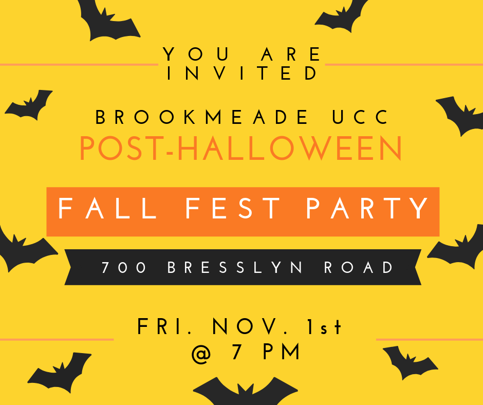 We’re extending the fun on Halloween weekend by having a day-after pumpkin & spook party at Brookmeade! Since Halloween this year falls on a school night (Thursday), we’re celebrating it this year on the next day, Nov 1st, on a Frightful Friday! All Nashville UCC churches are invited to come, still in Halloween & Fall festive costume, or just come to have great fun and UCC fellowship! Join us for fun fall activities and marshmallow roasting. Pizza provided! The party starts at 7:00 pm. See you there!
