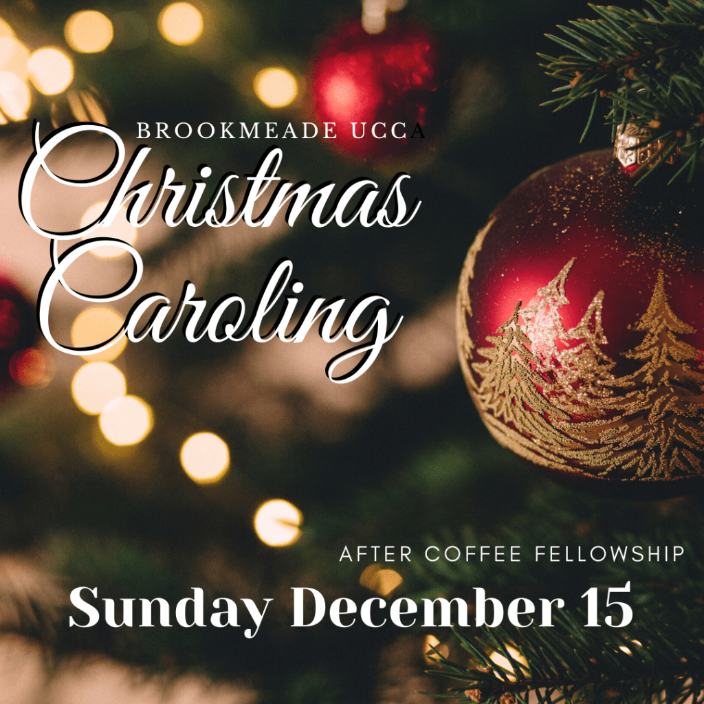 The Annual Brookmeade Christmas Caroling will take place Sunday 12/15. We will leave about 12:00-12:15pm, following Coffee Fellowship, and go to four homes of area Brookmeaders. Song books and driving directions will be available on the table in the foyer. Everyone is welcome! If you have any questions, please contact Julie L. or the church office.