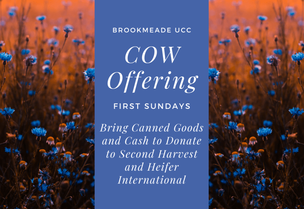 The first Sunday of every month is COW Sunday (Contribute Our Wealth). Everyone is encouraged to bring non-perishable food for Second Harvest. All money donations are split between Second Harvest and Heifer International. Brookmeade doing its part to alleviate hunger! Our next COW Offering is on January 5th.