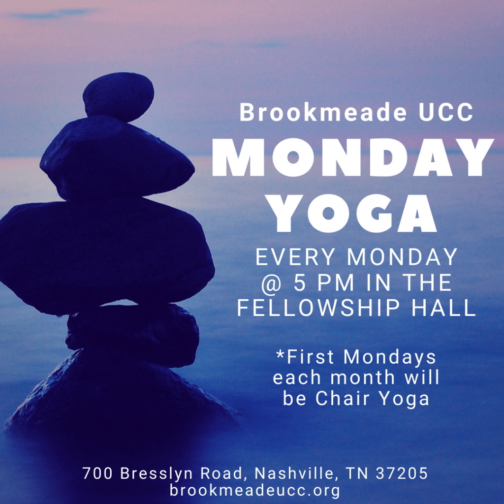 We are going to get together to practice yoga at Brookmeade. No experience necessary. We will be guided by “Yoga with Adriene” videos from YouTube. Bring a yoga mat or use the floor or borrow one from someone else (let us know if you need one). The first Monday of each month will be a Chair Yoga class. Call the church office with any questions. Otherwise, see you Mondays at 5pm in the Fellowship Room at Brookmeade!