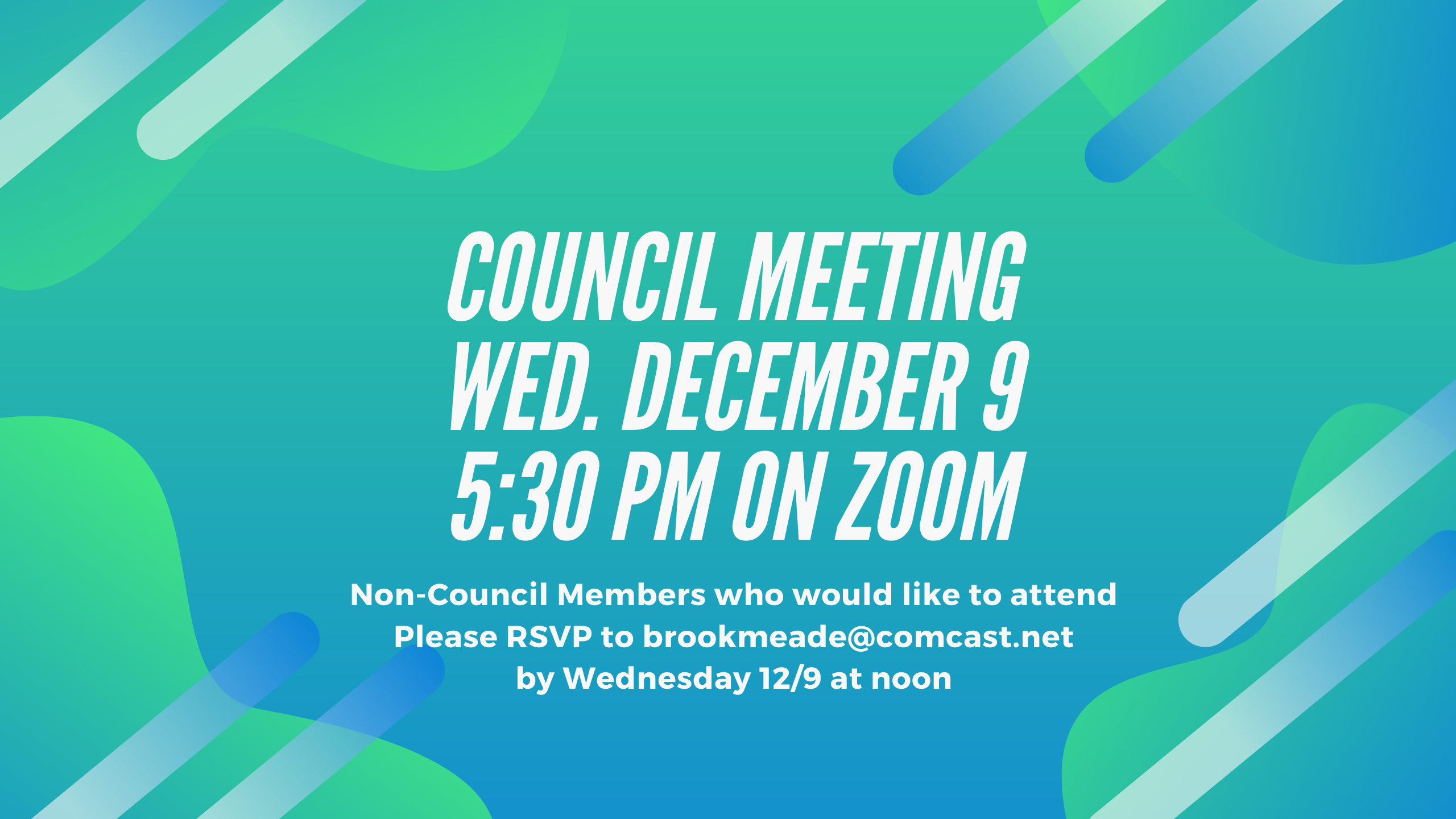 Wed. Dec. 9th: Council Meeting Posted bybrookmeadeofficeDecember 4, 2020Posted inUncategorized Council Meeting: Dec. 9th at 5:30 pm on Zoom. All non-council members who wish to attend the meeting, please RSVP to brookmeade@comcast.net by noon on Wed. Dec. 9th. Share this: Click to print (Opens in new window) Print Click to email a link to a friend (Opens in new window) Email Click to share on Facebook (Opens in new window) Facebook Click to share on X (Opens in new window) X Like Loading... Related