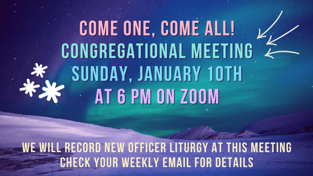 We will reconvene with congregational meetings on Sunday, January 10th at 6pm. Please plan to be present! New officers need to be present as we will be recording an affirmation liturgy for online worship. We will also continue discussing our options moving forward.