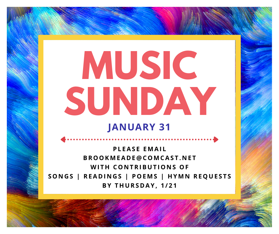 This month has a 5th Sunday (January 31st) which means it is a Music Sunday online service! Do you have a song, poem or reading you would like included in the service? Would you like to request a favorite hymn to be included? Please contact us with your contributions or requests by next Thursday, January 21st! We can’t wait to hear from you! Please email us at brookmeade@comcast.net.