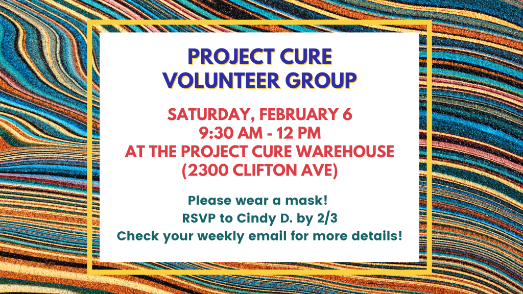 Our next date to volunteer at the Project CURE Warehouse (2300 Clifton Ave.) is Saturday, February 6th from 9:30 am – 12 pm. We will be sorting medical supplies. Newcomers are very welcome but please wear a mask! For planning reasons and to make sure we are COVID safe/socially distanced we need a head count for our group prior to volunteering. Please RSVP to Cindy D. by Wednesday, February 3rd if you plan to attend. You can RSVP to her by email or phone. You may also RSVP to the church office at brookmeade@comcast.net. Thanks and see you there!
