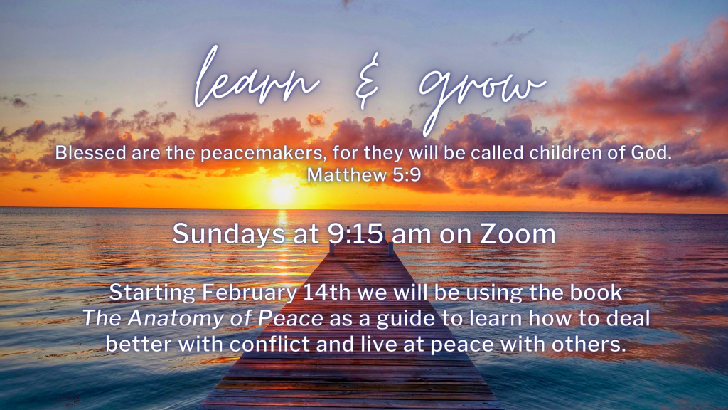 Join us for Learn and Grow Sunday mornings at 9:15 am via Zoom! Look for the link in the Sunday morning email! The Learn & Grow class is just finishing a study series on the Sermon on the Mount, where Jesus tells us: “Blessed are the peacemakers, for they will be called children of God.” (Matthew 5:9)