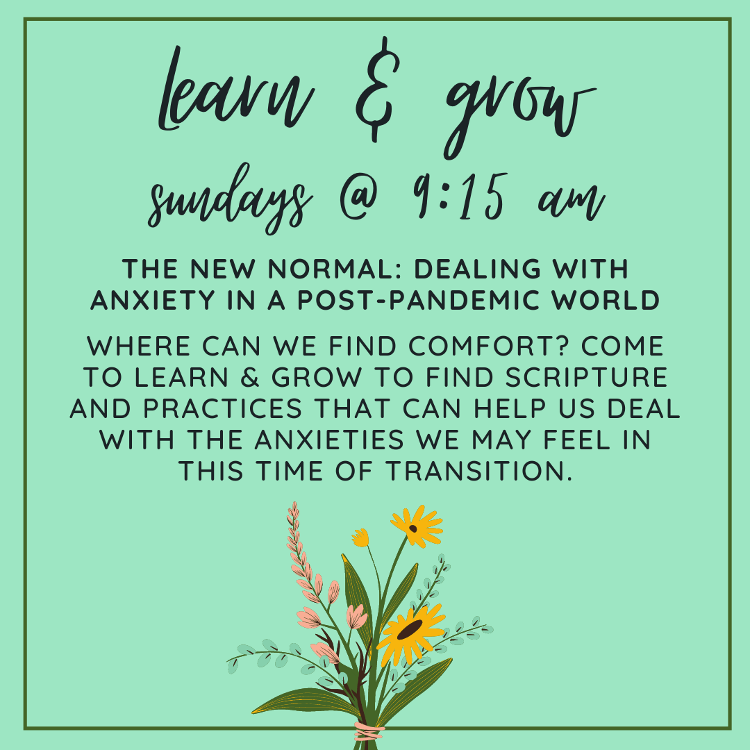 As we emerge from our homes and return to church, work, and the world, how do we feel? If we have anxiety, where can we find comfort? Come to Learn & Grow to find scripture and practices that can help us deal with the anxieties we may feel in this time of transition.