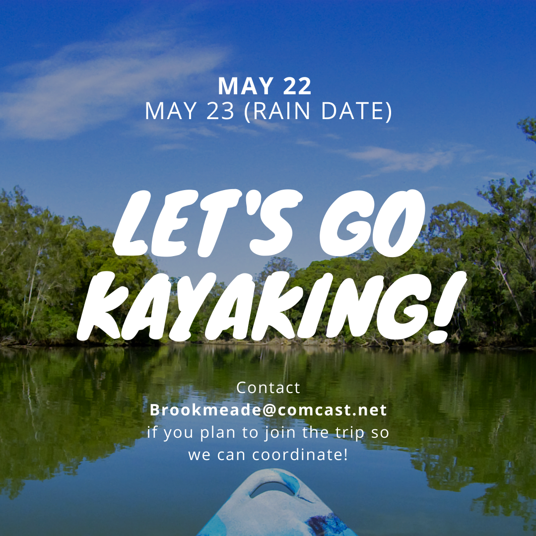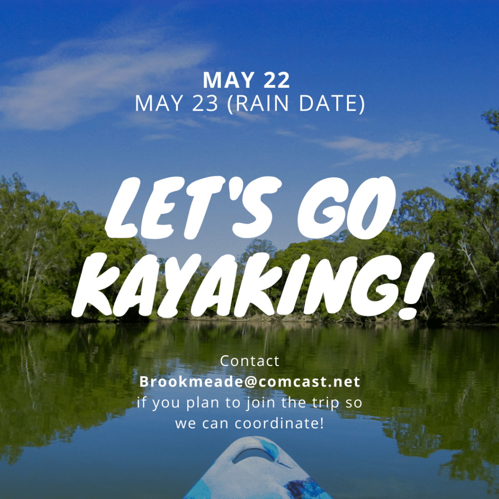 We are going to take a trip down the Harpeth River on May 22nd (May 23rd is our alternative rain date)! You can rent a kayak with life jacket and paddle from one of the outfitters nearby (Tip-A-Canoe will drop you off, too!), borrow a kayak from a friend with life jacket and paddle, or bring your own! Please RSVP to the church office by Thursday 5/13 – brookmeade@comcast.net – if you plan to attend (as we will need to reserve rentals in advance)! Please put your name and phone number, how long of a trip you would be comfortable with, and if you plan to use a rental in your RSVP with subject line “Harpeth Kayak Trip May 22,” so that we can coordinate to put our kayaks in all together. Bring drinks and snacks as we can stop and eat beside the river. Wear sunscreen and get ready for some fun!