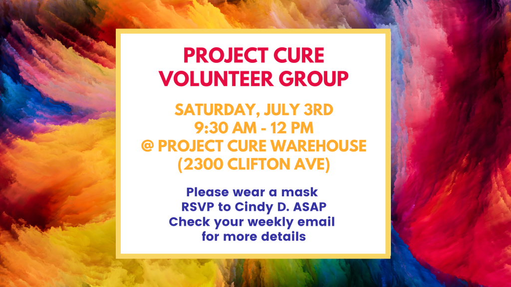 Our next trip to the Project CURE Warehouse (2300 Clifton Ave.) is scheduled for Saturday, July 3rd, 9:30 am – 12 pm. We will be sorting medical supplies. Newcomers are very welcome but please wear a mask! For planning reasons and to make sure we are COVID safe we need a head count for our group prior to volunteering. Please RSVP to Cindy D. ASAP if you plan to attend. You can also RSVP to the church office (615-352-4702, brookmeade@comcast.net). Thanks and see you there!