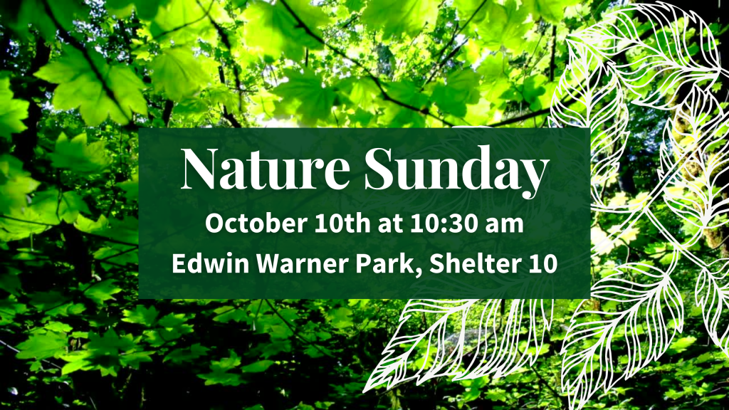 We are so excited to have Nature Sunday again in the park! We will have our Nature Sunday worship service on Sunday, October 10th at 10:30 am outdoors at Edwin Warner Park, Shelter 10. Please bring camp chairs if you are able, extra clothing layers, hats and sunscreen to prepare for any type of weather. We will have a potluck picnic following the service. There is no electricity for keeping food warm at the shelter so please bring insulated bags or food that can be served at room temperature. We look forward to enjoying time in nature together at the beautiful Edwin Warner park!