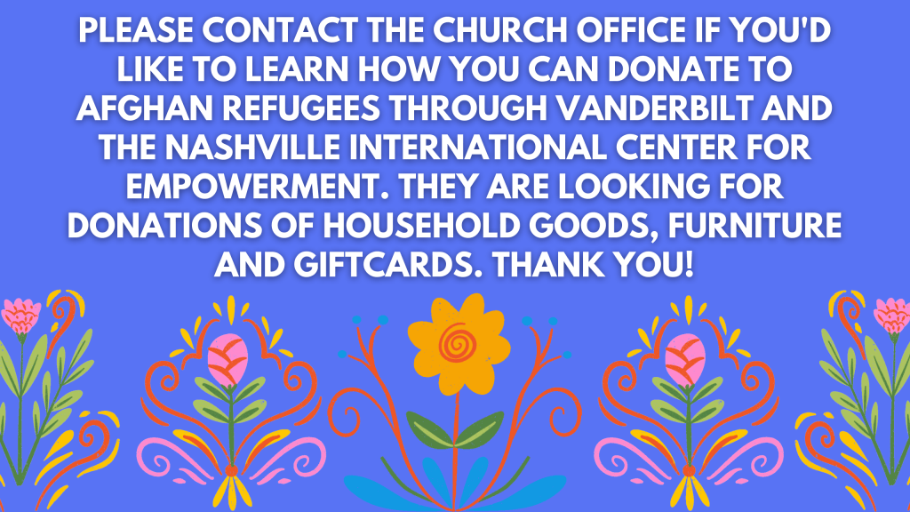 The Vanderbilt English Language Center is collecting furniture and resources for Afghan Refugees. They are accepting donations of free/cheap clean furniture from the Nashville area, as well as gift cards (Target, Walmart, Kroger, Publix etc.). Please contact the church office if you’d like to learn how to make a donation. Any help is appreciated!