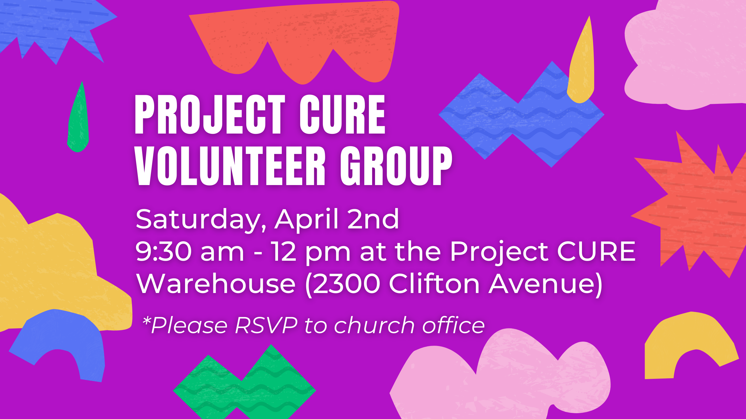 Our next trip to the Project CURE Warehouse (2300 Clifton Ave.) is scheduled for Saturday, April 2nd, 9:30 am – 12 pm. We will be sorting medical supplies. Newcomers are very welcome but please wear a mask! For planning reasons and to make sure we are COVID safe we need a head count for our group prior to volunteering. Please RSVP to Cindy D. ASAP (or the church office) if you plan to attend. Thanks and see you there!