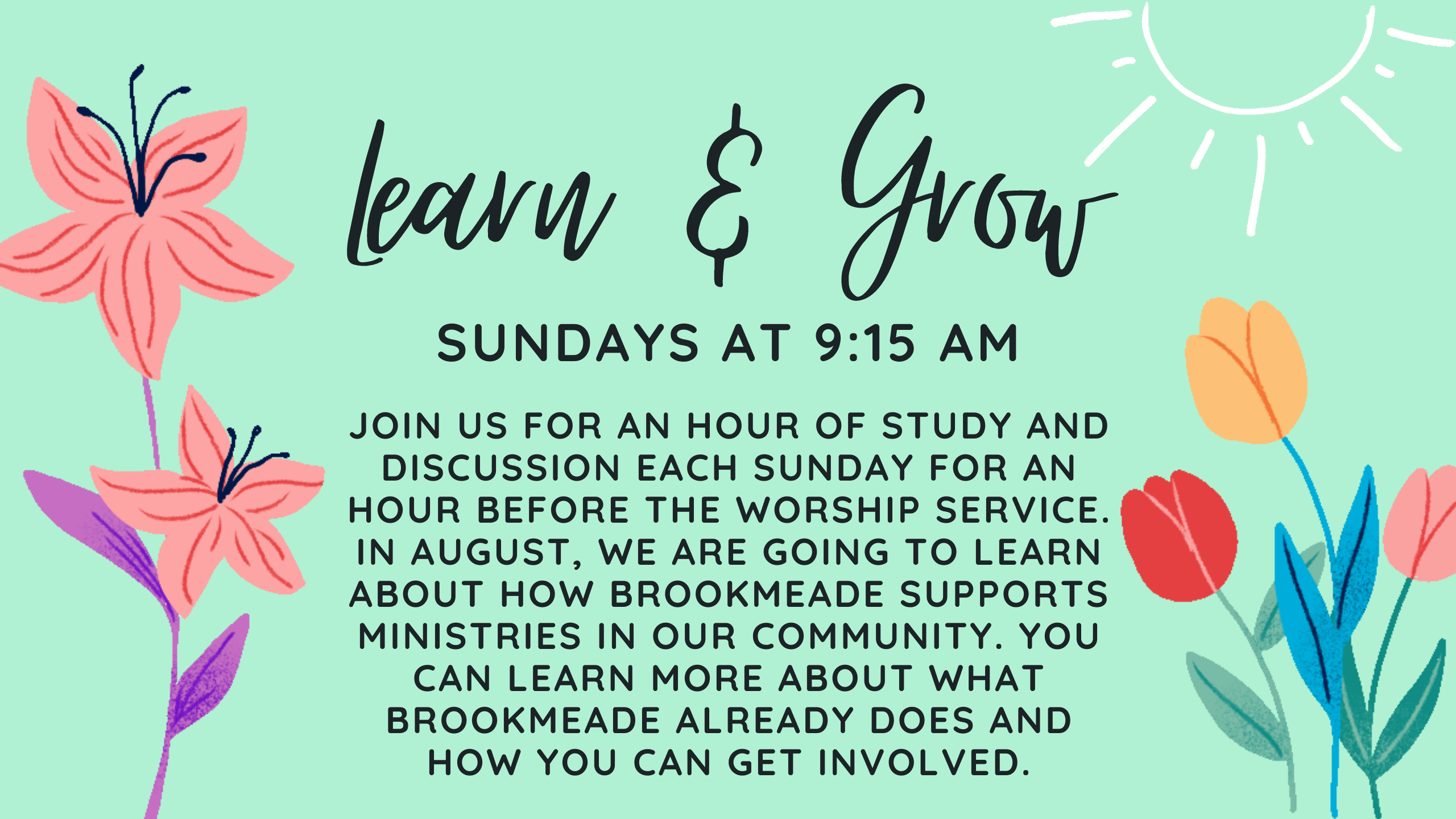 Learn & Grow returns on August 7th at 9:15 a.m. Join us for an hour of study and discussion each Sunday for an hour before the worship service. In August, we are going to learn about how Brookmeade supports ministries in our community. You can learn more about what Brookmeade already does and how you can get involved.
