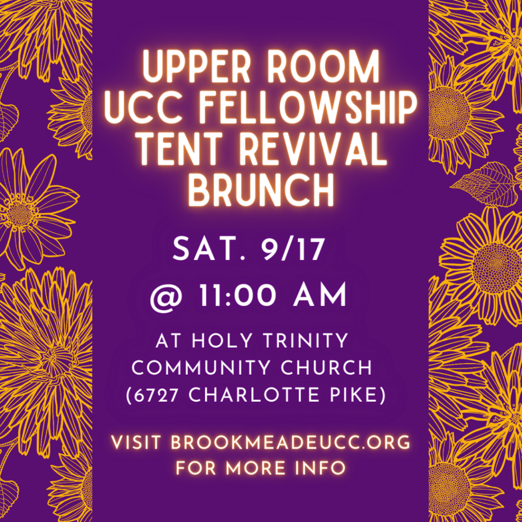 Just a reminder that the Upper Room UCC Fellowship Brunch is this Saturday, Sept 17th @ 11:00 AM at Holy Trinity Community Church (6727 Charlotte Pike)! Theme: “Revive Us Again!”