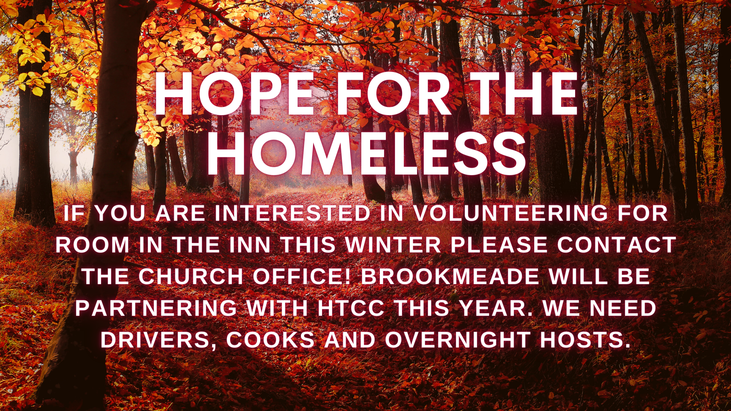 For many years, Brookmeade has enthusiastically supported the work of Room In The Inn here in Nashville, helping to provide food and shelter to those in need on our streets and in our community. Since the Covid pandemic, we have been unable to help with this ministry. We are trying this Winter to partner with our sister congregation, Holy Trinity Community Church UCC, in order to participate in this much needed service. We need to determine how many Brookmeaders can help out this Winter. The folks at RITI have said that their greatest need is congregations to host guests on Sunday and Monday evenings (We will determine which night based on availability of volunteers). Areas to help are in driving guests from downtown to Brookmeade, helping to prepare and serve an evening meal, preparing bag lunches for the next day, washing linens the following week, serving as an overnight host to our guests, and driving guests from Brookmeade to downtown in the morning. If you are able and interested in serving in any of these areas, please contact Mike R. or the church office so we can ascertain how we can best support this vital ministry in our city.