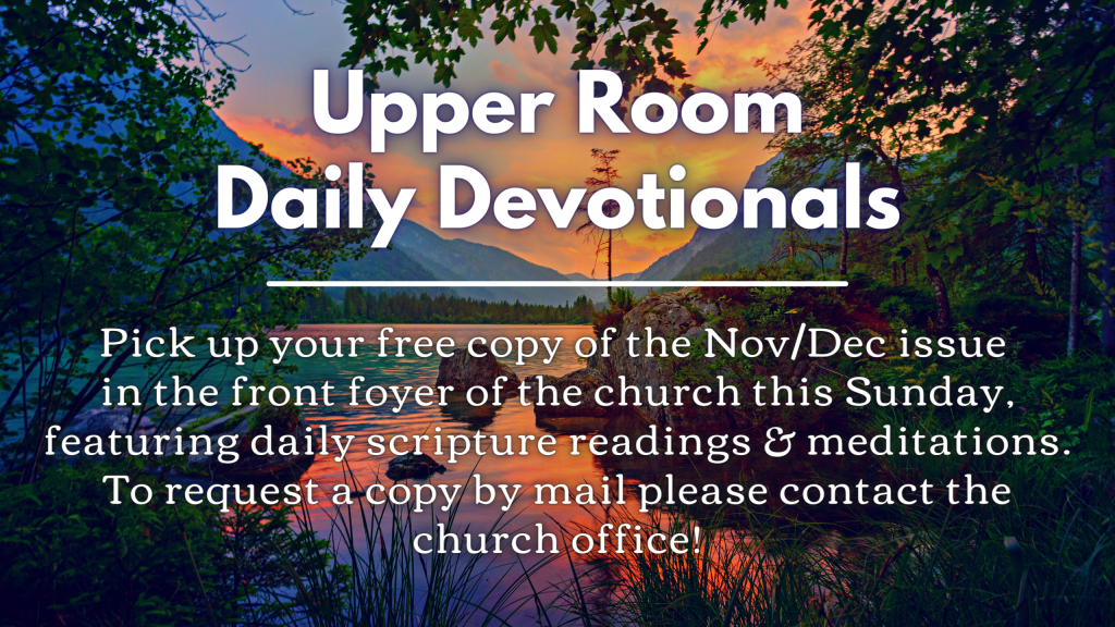 New UPPER ROOM daily devotionals for Nov-Dec are now available without cost in the foyer of the church for daily prayer and meditation on sacred scriptures. The UPPER ROOM is a great devotional aid for reflection as we enter the Thanksgiving and Advent seasons. If anyone needs a copy mailed to them, you are welcome to contact the church office.