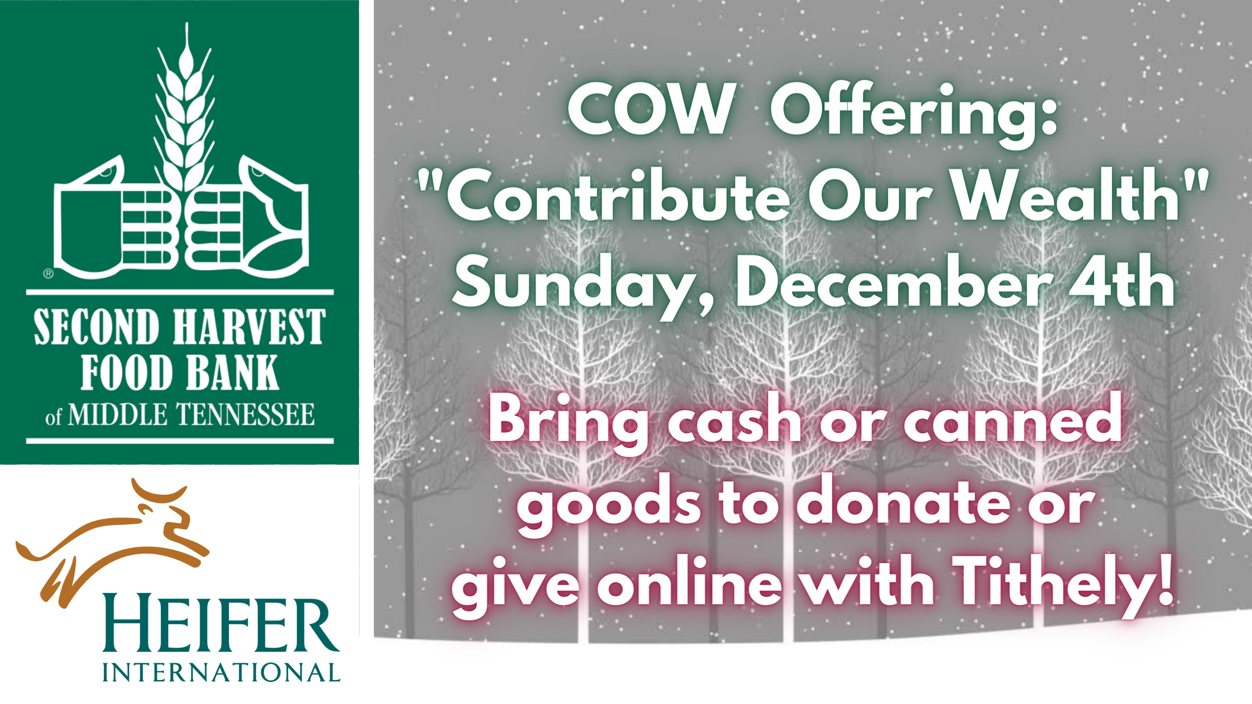 First Sundays of the month we collect our COW Offering. Monetary donations are split between Second Harvest of Middle TN and Heifer International. You can also bring canned goods on Sunday morning to donate to Second Harvest. Please designate your check for COW Offering or if you give online you can choose COW offering on the drop-down menu on Tithe.ly. Thank you for supporting these important organizations and helping Brookmeade fight hunger!