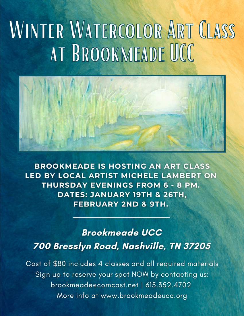 We joyfully announce that Brookmeade will again offer a watercolor class taught by Michele Lambert. The class will again be on Thursday evenings from 6 to 8 pm. January 19, 26 and February 2 and 9. There may be a fifth “add on” class the 16th of February if those attending decide they would like to have one more session. Cost will be $80.00 for four classes, and materials will be included. There is a sign up sheet in the hallway. Please contact the church office for details and to sign up, or email Adora.