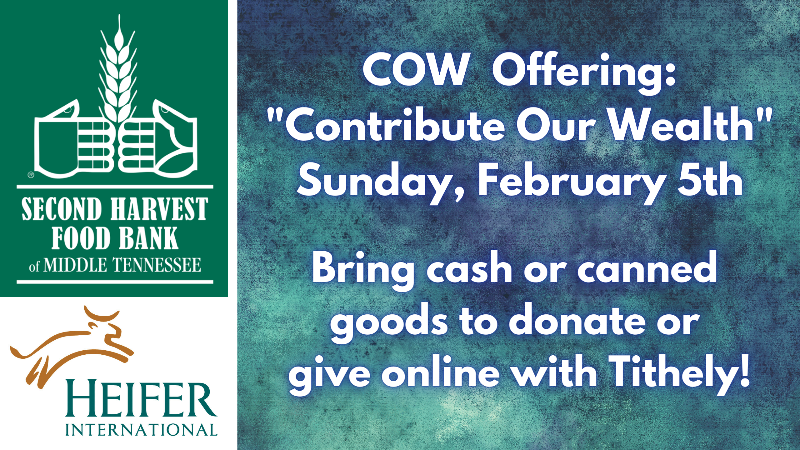 First Sundays of the month we collect our COW Offering. Monetary donations are split between Second Harvest of Middle TN and Heifer International. You can also bring canned goods on Sunday morning to donate to Second Harvest. Please designate your check for COW Offering or if you give online you can choose COW offering on the drop-down menu on Tithe.ly. Thank you for supporting these important organizations and helping Brookmeade fight hunger!