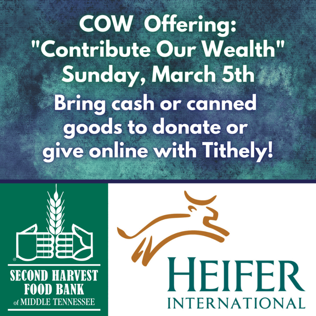 First Sundays of the month we collect our COW Offering. Monetary donations are split between Second Harvest of Middle TN and Heifer International. You can also bring canned goods on Sunday morning to donate to Second Harvest. Please designate your check for COW Offering or if you give online you can choose COW offering on the drop-down menu on Tithe.ly. Thank you for supporting these important organizations and helping Brookmeade fight hunger!