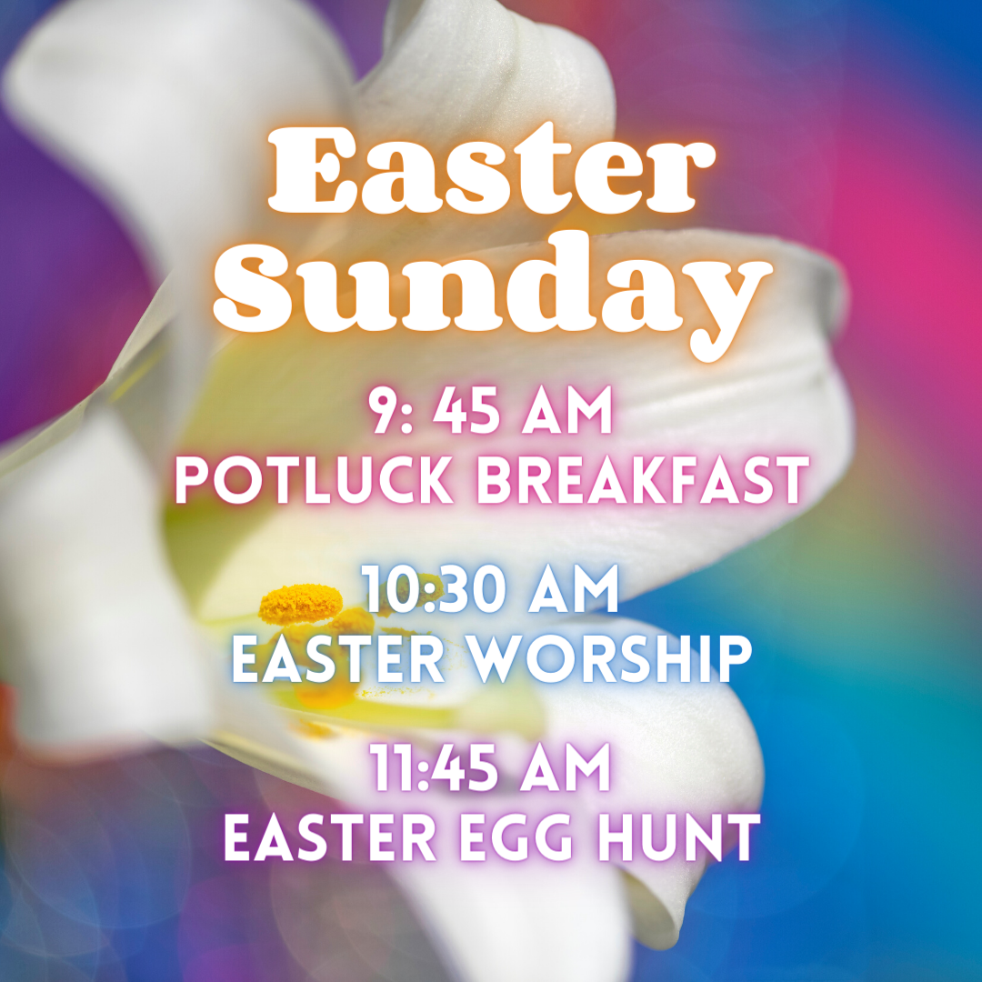 Easter Sunday we have three celebrations to anticipate: a potluck breakfast at 9:45 am coordinated by our industrious Fellowship Team, Easter worship at 10:30 am, and an Easter Egg Hunt following worship designed especially for our youngest members. We will all have fun before and after our time of joyful worship!