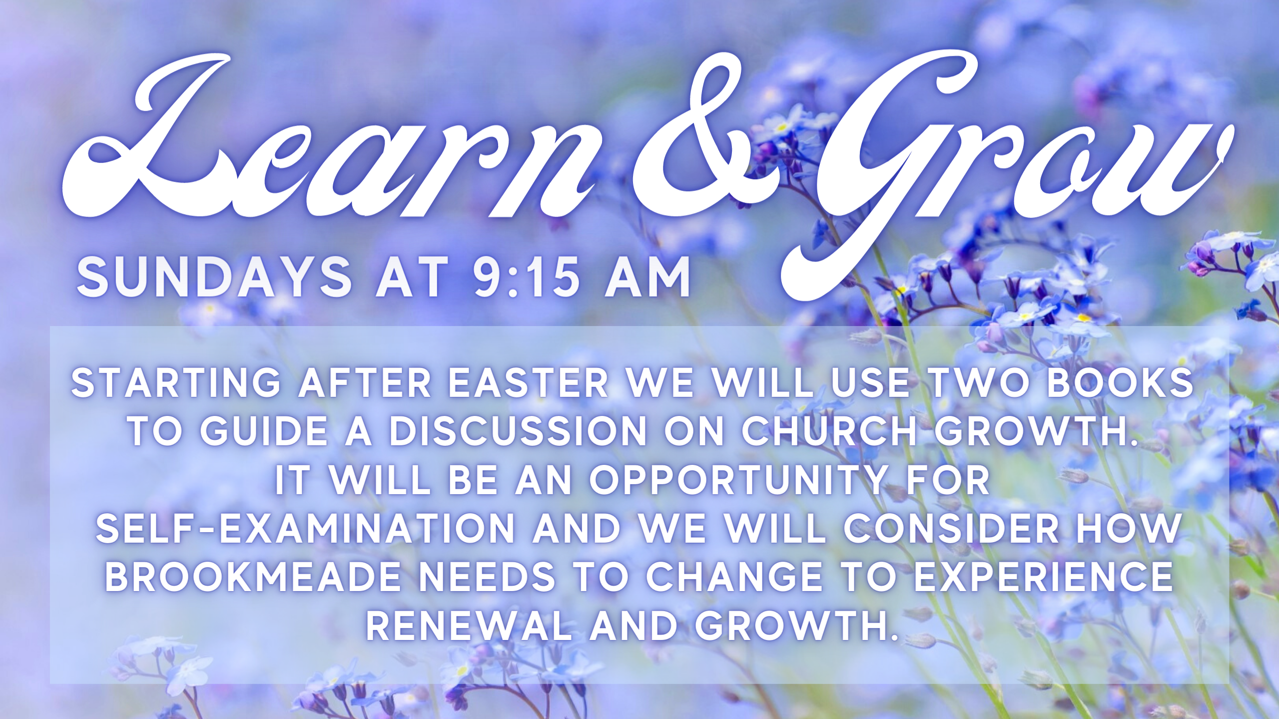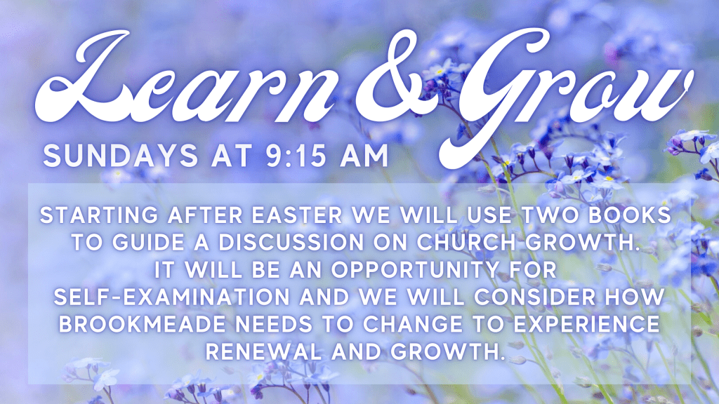 Learn & Grow meets Sundays at 9:15 am. After Easter we will use two books to guide a discussion on church growth. It will be an opportunity for self-examination and consider how Brookmeade needs to change to experience renewal and growth. “In “Prophetic Renewal: Hope for the Liberal Church” Reverend Michael S. Piazza tells the story of the Cathedral of Hope and its growth against all odds.” We will also use “Liberating HOPE!: Daring to Renew the Mainline Church” by Michael S. Piazza and Cameron B. Trimble. “[It] provides concrete and tangible 21st century insight to those churches looking to renew their congregations through hope and optimism rooted in the resurrection.” This will be a challenging study, but we hope it will help prepare the congregation for the future.