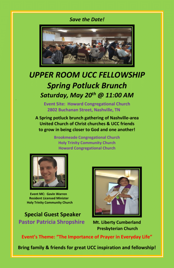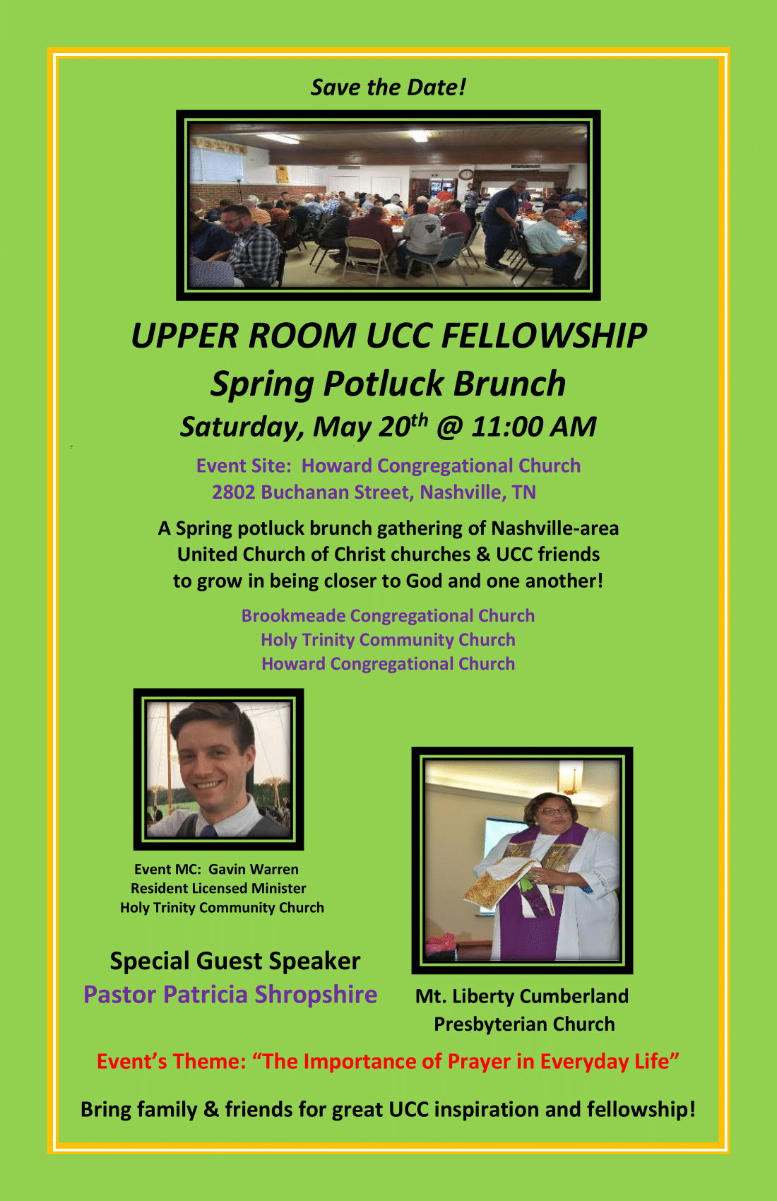 A gathering of all Nashville–area UCC churches for a potluck brunch at Howard Congregational Church (2802 Buchanan St.) to grow in the spirit of prayer and in fellowship with one another! Special Guest Speaker: Rev. Patricia Shropshire, Lead Chaplain at Vanderbilt University Medical Center! Rev. Patricia has deep ties to the Nashville-area UCC as she was formerly Pastor for Congregational Care at Holy Trinity Community Church, and also in the past served as a worship leader at Howard Congregational Church! Presently, Rev. Patricia serves as pastor of Mt. Liberty Cumberland Presbyterian Church in Dickson County. Will be speaking on the topic: “The Importance of Prayer in Everyday Life”. SAVE THE DATE! Bring family & friends and a brunch culinary delight to share for great UCC fellowship & inspiration!