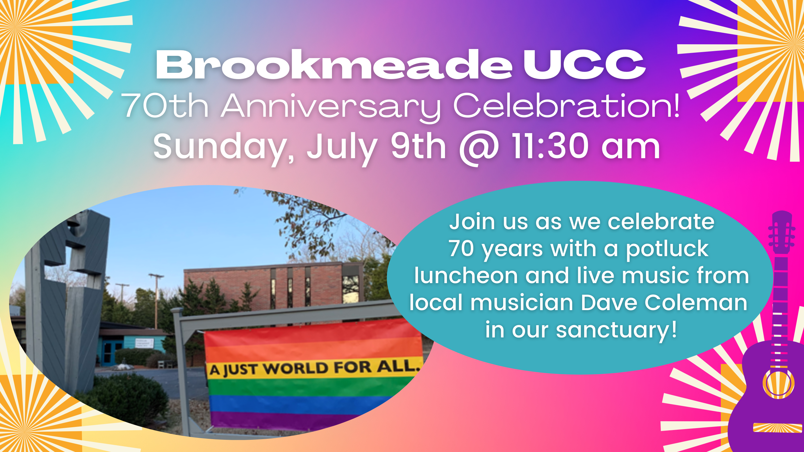 Following worship on Sunday, July 9th, a great potluck celebratory luncheon is planned for Brookmeade’s 70th anniversary! Yes, it’s been 70 years since Brookmeade Congregational Church was founded in July 1953 by a faithful remnant of progressive Christians from the previously disbanded Collegeside Congregational Church started in 1928.