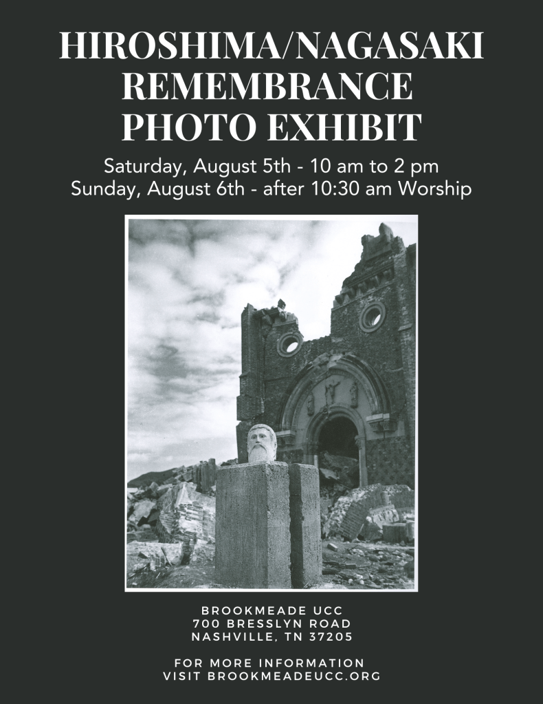 Brookmeade Congregational Church United Church of Christ is a Justice and Peace congregation within the UCC. We are proud to share with the public an exhibit of selected photographs taken by its former member Joe O’Donnell during the four years immediately following these events. Please join us either this Saturday, August 5 between 10:00am and 2:00pm, or following our worship service Sunday. Worship will begin at 10:30am and focus on commemoration of this milestone of world history.