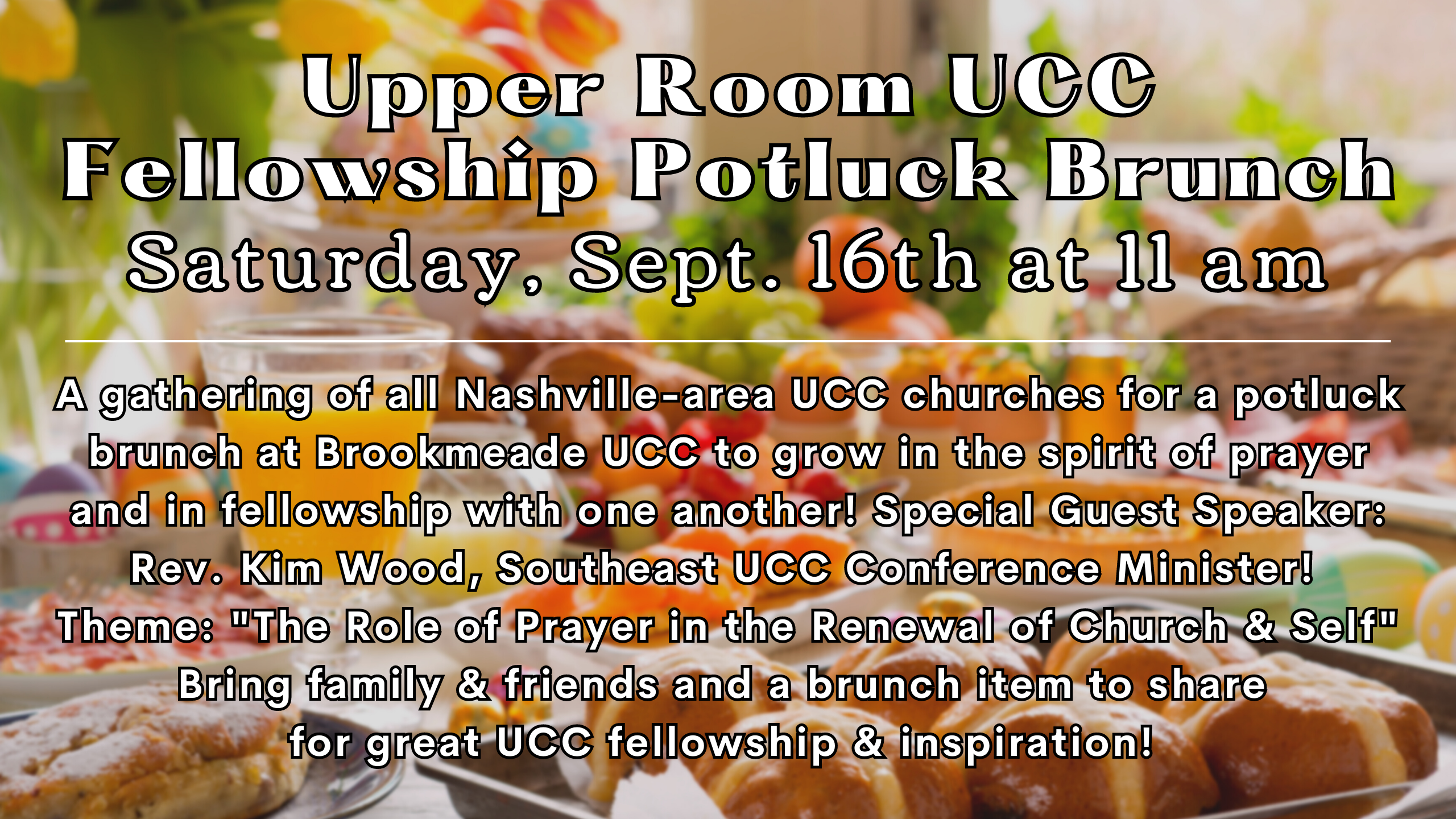 Brookmeade will host a great gathering of our three Nashville-area UCC churches on Saturday, Sept 16th @ 11:00 AM: Brookmeade Congregational Church, Holy Trinity Community Church, and Howard Congregational Church. Special Guest Speaker: Rev. Kim Wood, Southeast UCC Conference Minister! Theme: “The Role of Prayer in the Renewal of Church & Self” Bring family, friends, and a culinary delight for great UCC fellowship & inspiration!