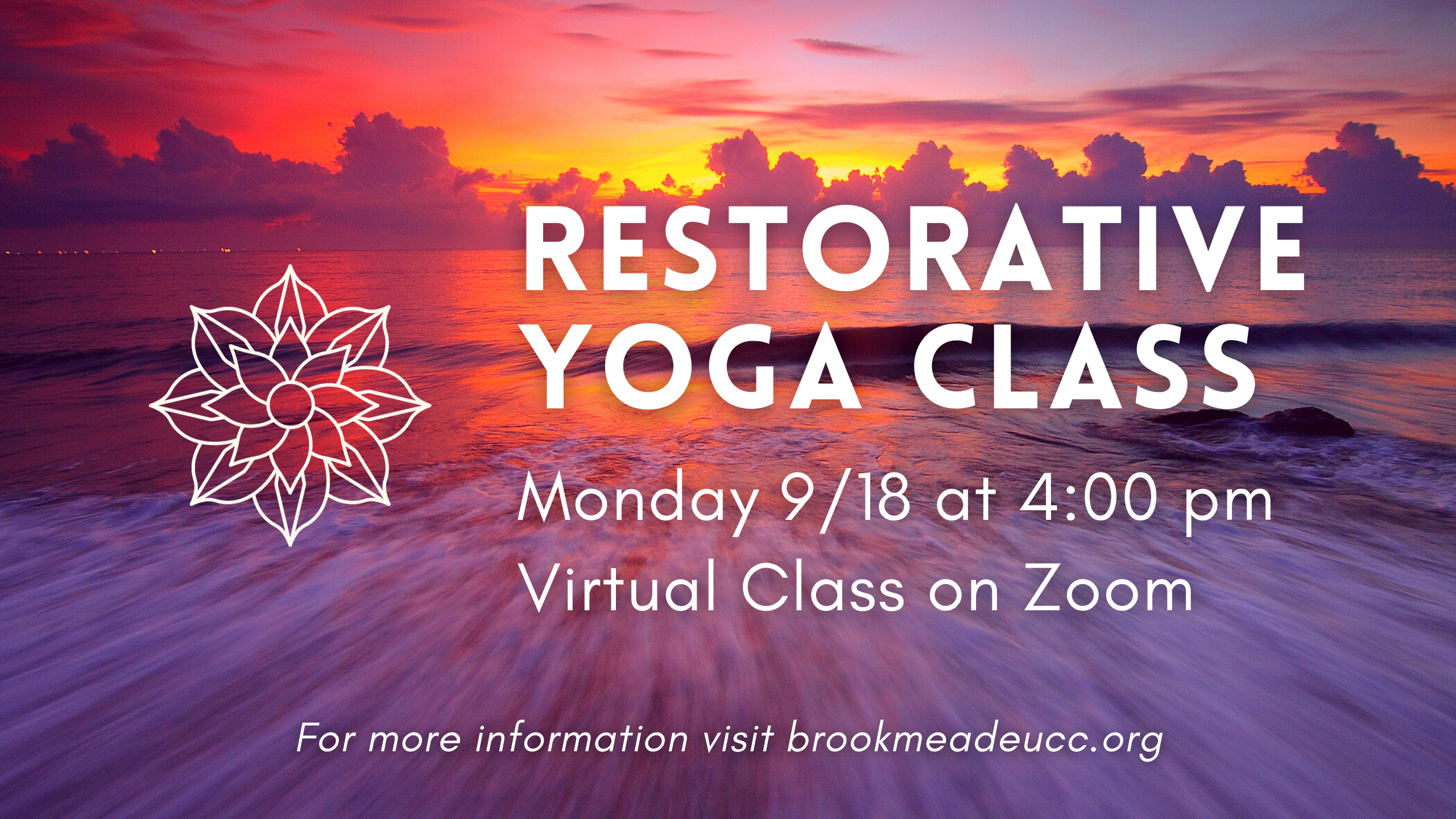 Our Brookmeade Yoga Class meets weekly on Mondays at 4 pm and is led by instructor Ali Sperry. This Monday, 9/18, the yoga class will be held online only through Zoom. The cost is $20. To receive the zoom link, please contact the church office (brookmeade@comcast.net) by Monday morning.