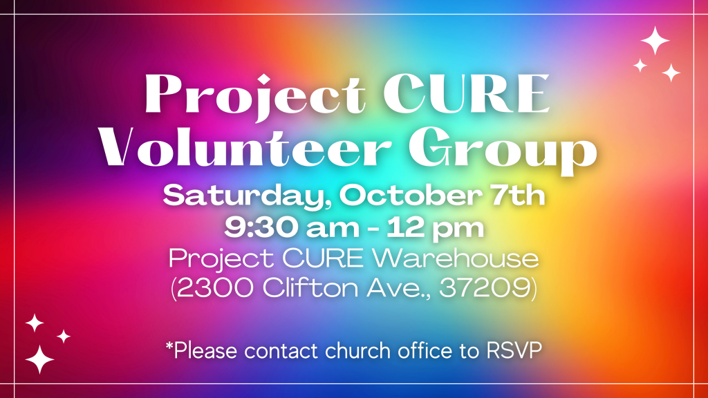 Our next trip to the Project CURE Warehouse (2300 Clifton Ave.) is scheduled for Saturday, October 7th from 9:30 am – 12 pm. We will be sorting medical supplies. Newcomers are very welcome! For planning reasons we need a head count for our group prior to volunteering. Please RSVP to the church office ASAP if you plan to attend. Thanks and see you there!