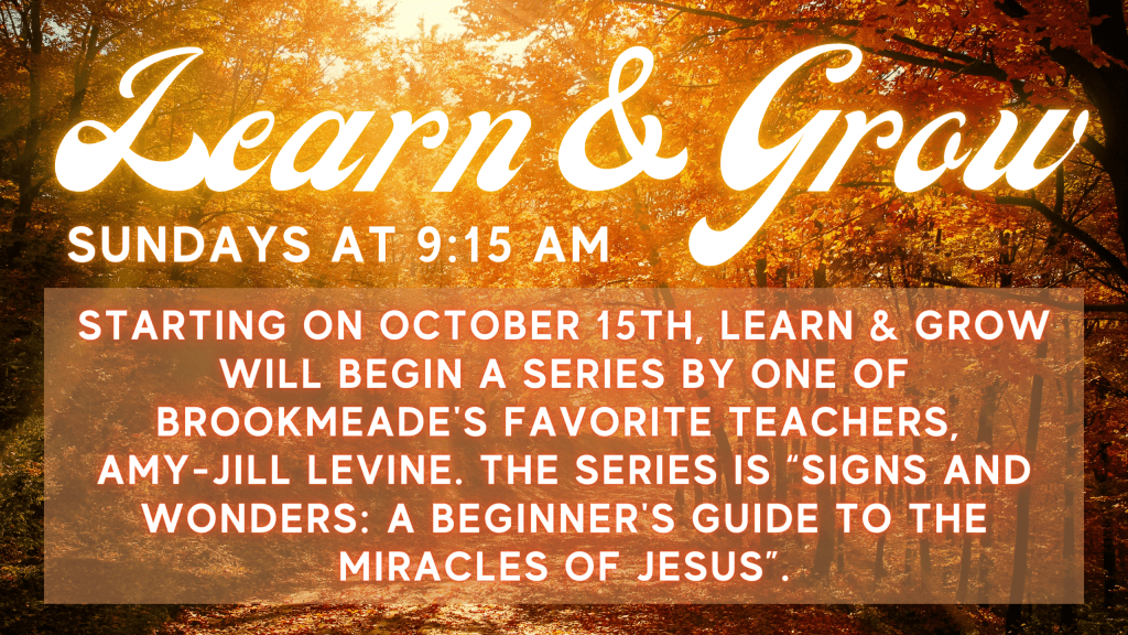 Starting on October 15th, Learn & Grow will begin a series by one of Brookmeade’s favorite teachers, Amy-Jill Levine. The series is Signs and Wonders: A Beginner’s Guide to the Miracles of Jesus. The lessons will include: