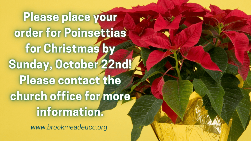 Every year, generous members order beautiful poinsettias to dedicate to loved ones and decorate our sanctuary for the holiday season. We are now accepting orders for 6 inch ($10) and 8 inch ($17) poinsettias in red or white. We ask folks to take their poinsettias home after the Christmas Eve service. You can find order forms in the front foyer or just contact the church office to place your order no later than Sunday, October 22nd. Thank you!