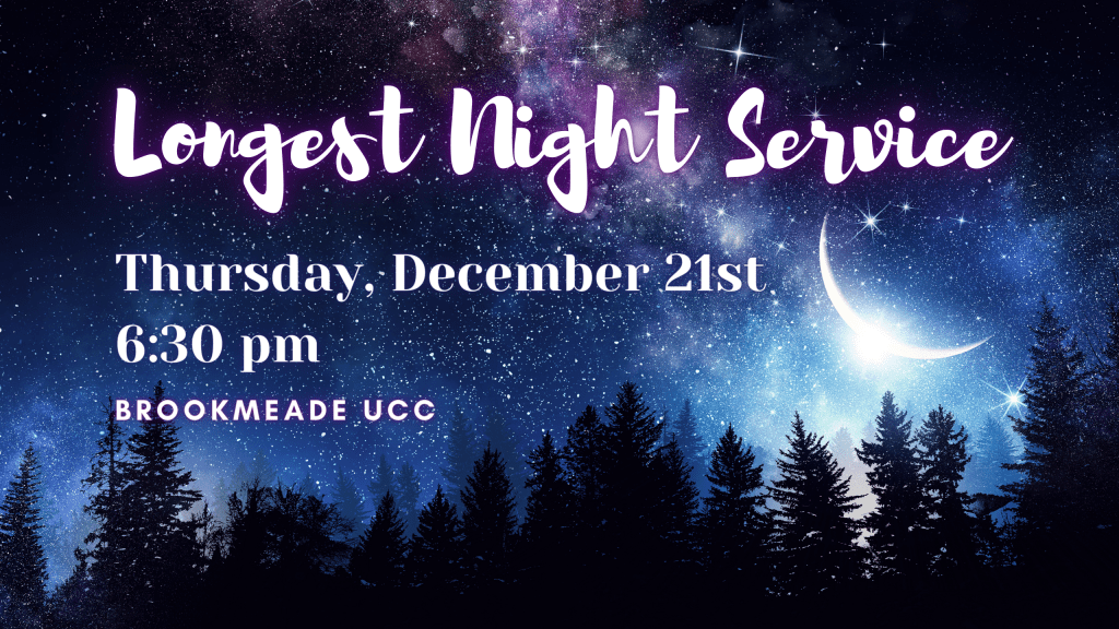 On Thursday, December 21st, the longest time of darkness during the year, the winter solstice, we will share a Longest Night service at Brookmeade. At 6:30 pm we will gather in the sanctuary for a service of reflection and contemplation. In a season where the focus is joy and celebration (even as we wait), most of us struggle this time of year with something. This is the service where we acknowledge that we are not alone in our need for some relief from the peer pressure to “rejoice” and instead have some time just to be, to feel, to lament. Come, join us as we experience the darkness and find that hope exists there too. All are encouraged to attend, and anyone is welcome.