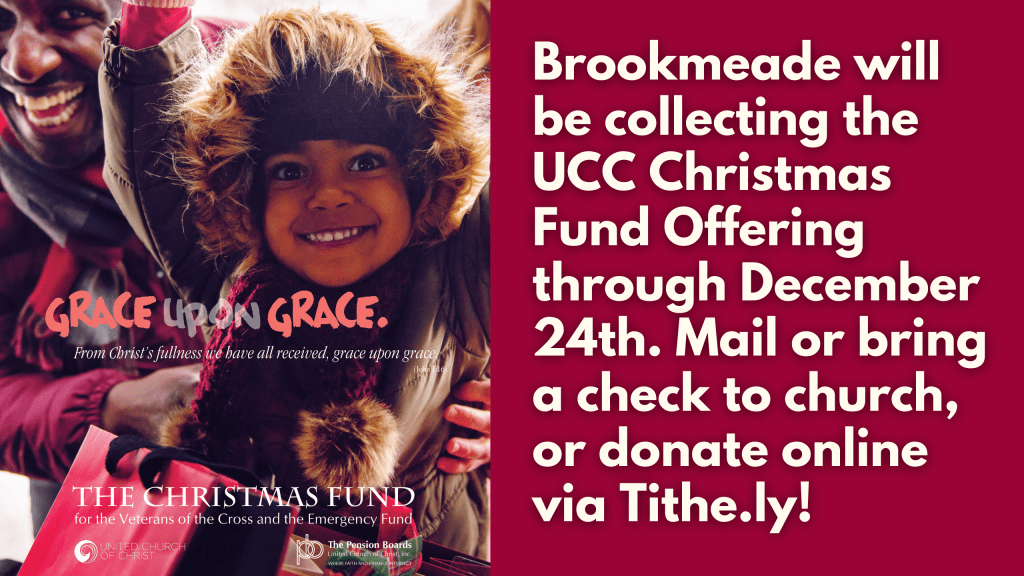 Brookmeade will be collecting for the UCC Christmas Fund Offering on Sunday, December 24th! The Christmas Fund has been caring for active and retired clergy and lay employees of the United Church of Christ for over 100 years, providing emergency grants, supplementation of small annuities and health premiums, and Christmas “Thank You” gift checks each December to our lower-income retirees.