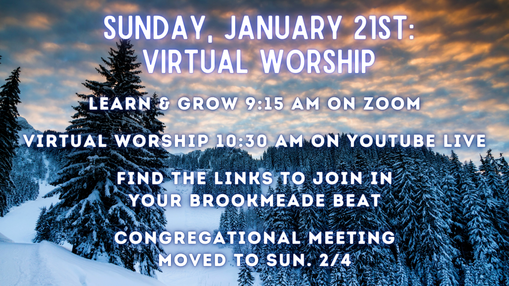 Due to the inclement weather and with an abundance of caution we have decided to cancel in-person worship for this Sunday, January 21st. Pastor Liz will provide a brief virtual worship service on YouTube Live at 10:30 am. Click HERE to watch live on Sunday. Learn & Grow will meet at 9:15 am on Zoom. You can find the link to participate in your Brookmeade Beat. Our Congregational Meeting has been moved to Sunday, February 4th following worship. Thank you and please stay safe!
