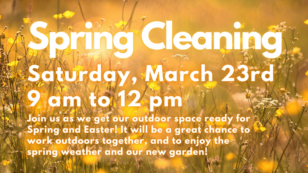 Join us as we get our outdoor space ready for Spring and Easter! We will have a “Spring Cleaning” of our garden and grounds on Saturday, March 23rd from 9 am to 12 pm. It will be a great chance to work outdoors together, and to enjoy the spring weather and our new garden!