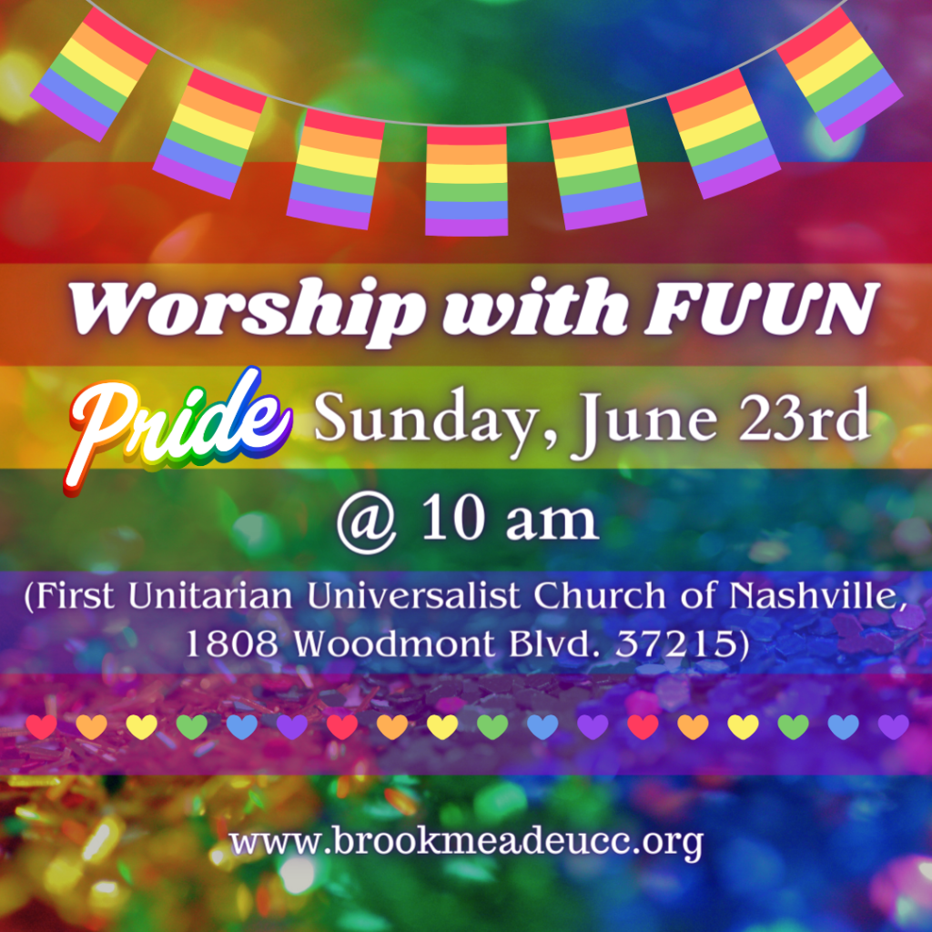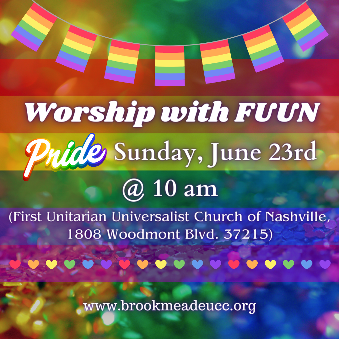 Brookmeade UCC and FUUN (First Unitarian Universalist Church of Nashville) will be sharing a joint worship service hosted at FUUN (1808 Woodmont Blvd, Nashville). The worship will begin at 10 am. Pastor Liz will be preaching, and Rev. Wesley King will lead music. We will continue our Pride Sermon Series The Good News of Broadway (In Musicals). We hope you will plan to join us in person or online! Please note there will not be a service held at the Brookmeade building Sunday, 6/23.