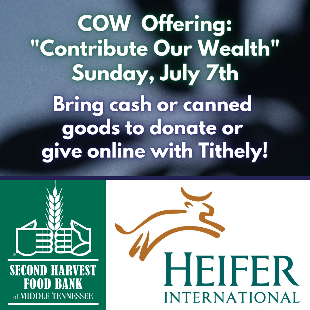 First Sundays of the month we collect our COW (“Contribute Our Wealth”) Offering. Monetary donations are split between Second Harvest of Middle TN and Heifer International. You can also bring canned goods on Sunday morning to donate to Second Harvest. Please designate your check for COW Offering or if you give online you can choose COW offering on the drop-down menu on Tithe.ly. Thank you for supporting these important organizations and helping Brookmeade fight hunger!