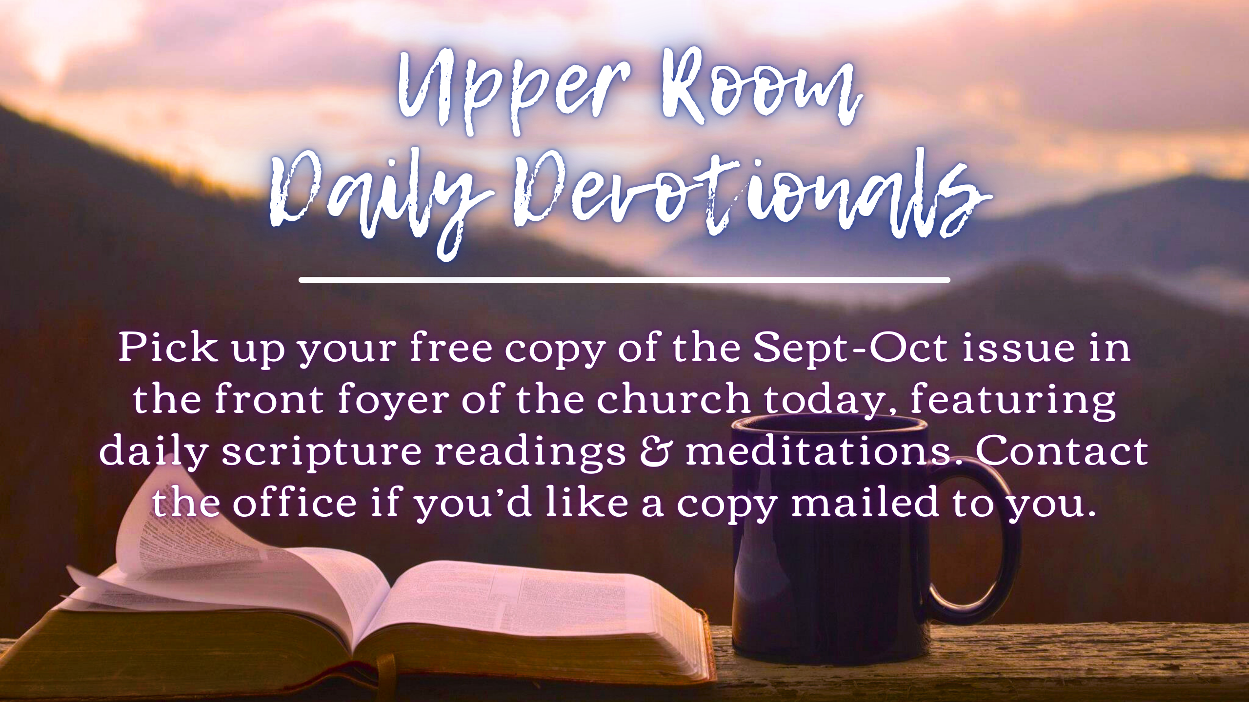 Now available without cost in the foyer of the church is the Sept-Oct issue of the UPPER ROOM daily devotional. The UPPER ROOM is a great devotional aid for having daily set-aside time for prayer & meditation on sacred scriptures to grow in being closer to God and God’s people all across the world. Published in 34 languages & distributed all over the planet, the UPPER ROOM is a daily connection with the universal communion of saints with God & one another! Pick up a copy in the foyer of the church or contact the church office to have a copy mailed to you.