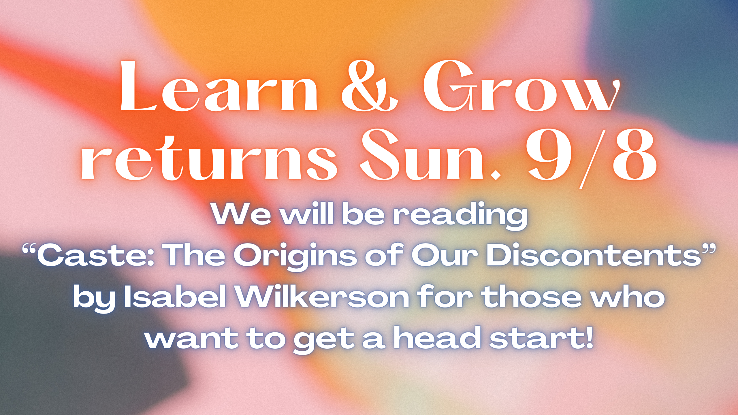 Learn & Grow will resume on Sunday, September 8th at 9:15 am. We will be studying the book Caste: The Origins of Our Discontents by Isabel Wilkerson. We encourage you to add it to your summer reading list and begin reading it before the class starts.