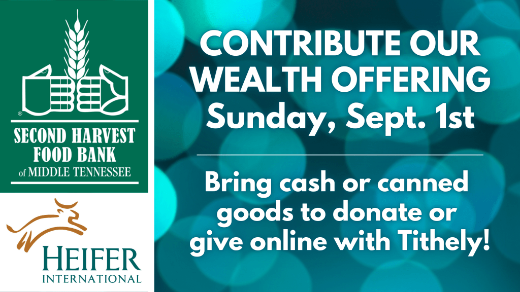 First Sundays of the month we collect our COW (“Contribute Our Wealth”) Offering. Monetary donations are split between Second Harvest of Middle TN and Heifer International. You can also bring canned goods on Sunday morning to donate to Second Harvest. Please designate your check for COW Offering or if you give online you can choose COW offering on the drop-down menu on Tithe.ly. Thank you for supporting these important organizations and helping Brookmeade fight hunger!