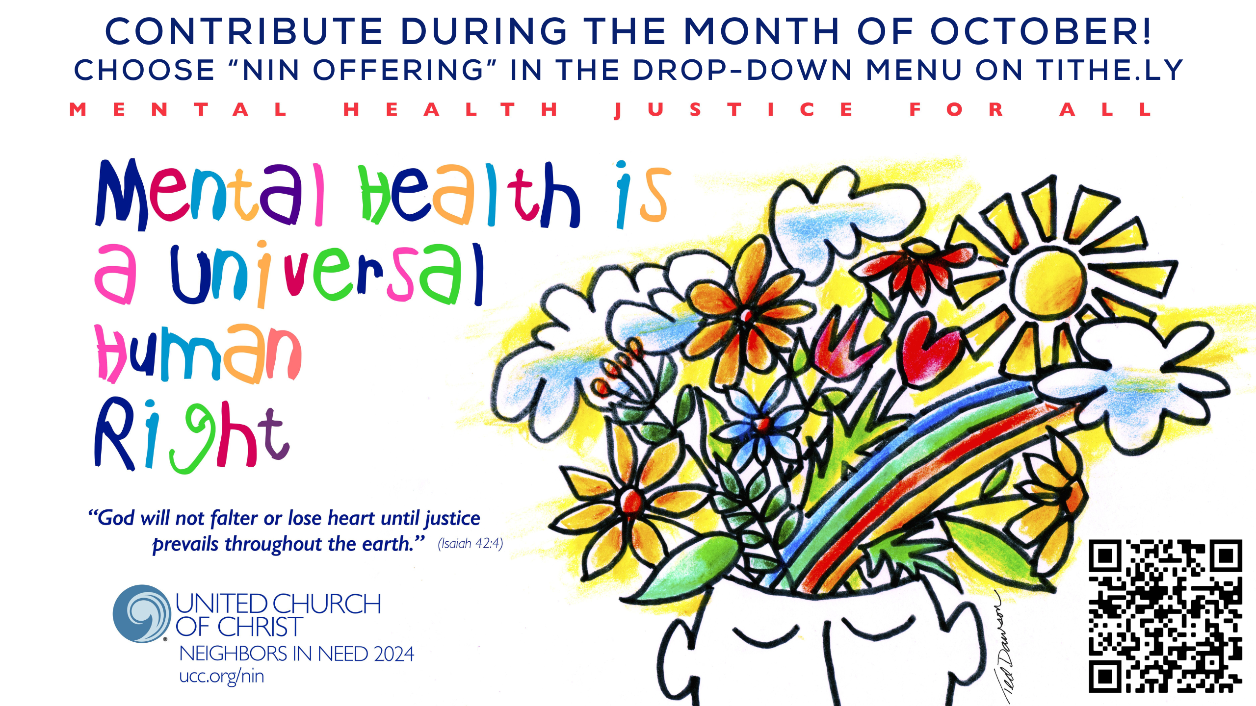 Please consider supporting the 2024 Neighbors in Need Offering, one of the 5 UCC offerings we contribute to annually. This year’s theme is “Mental Health Justice For All!” A just world for all is a world where the human rights and well-being of people with mental health challenges are respected, no matter who you are or where you are in life’s mental health journey. One-third of the offering supports Council for American Indian Ministry (CAIM). Two-thirds are used by Justice and Witness Ministries to provide grants to UCC churches and support a variety of justice initiatives, advocacy efforts, and direct service projects. We will begin collecting the NIN offering on October 6, 2024, but contributions can be made during the entire month of October by sending a check to Brookmeade (please designate NIN offering in the memo line), or by giving online with Tithe.ly (just select NIN Offering in the drop-down menu). We thank you for your support and generosity!