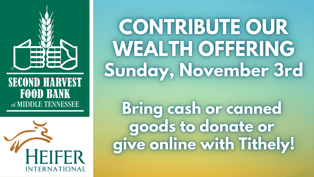 First Sundays of the month we collect our COW (“Contribute Our Wealth”) Offering. Monetary donations are split between Second Harvest of Middle TN and Heifer International. You can also bring canned goods on Sunday morning to donate to Second Harvest. Please designate your check for COW Offering or if you give online you can choose COW offering on the drop-down menu on Tithe.ly. Thank you for supporting these important organizations and helping Brookmeade fight hunger!