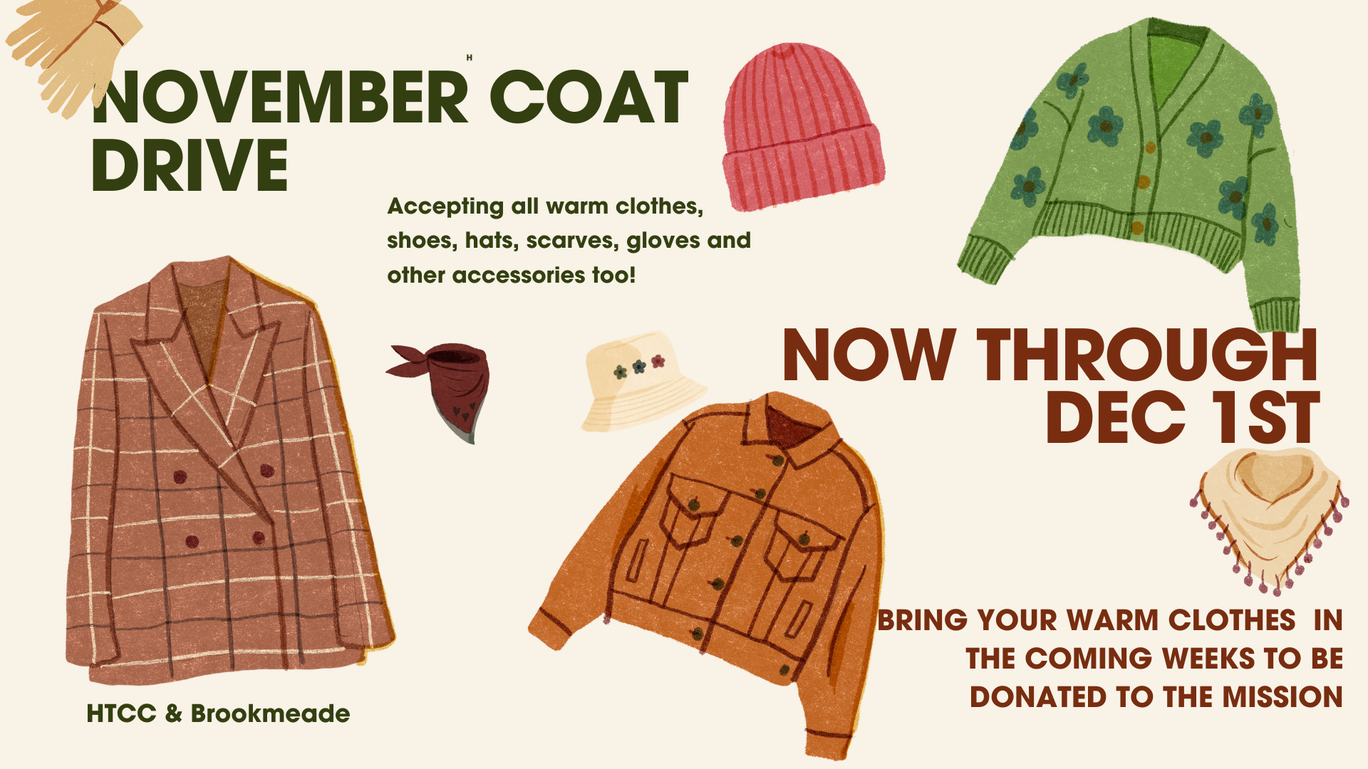 HTCC and Brookmeade are hosting a winter coat drive. We will be collecting coats and other warm clothes (shoes, sweaters, hats, scarves, gloves) all through the month of November until December 1st to be donated to those in need! Feel free to bring donations on Sundays or contact the office to arrange another time to drop items off (brookmeade@comcast.net).