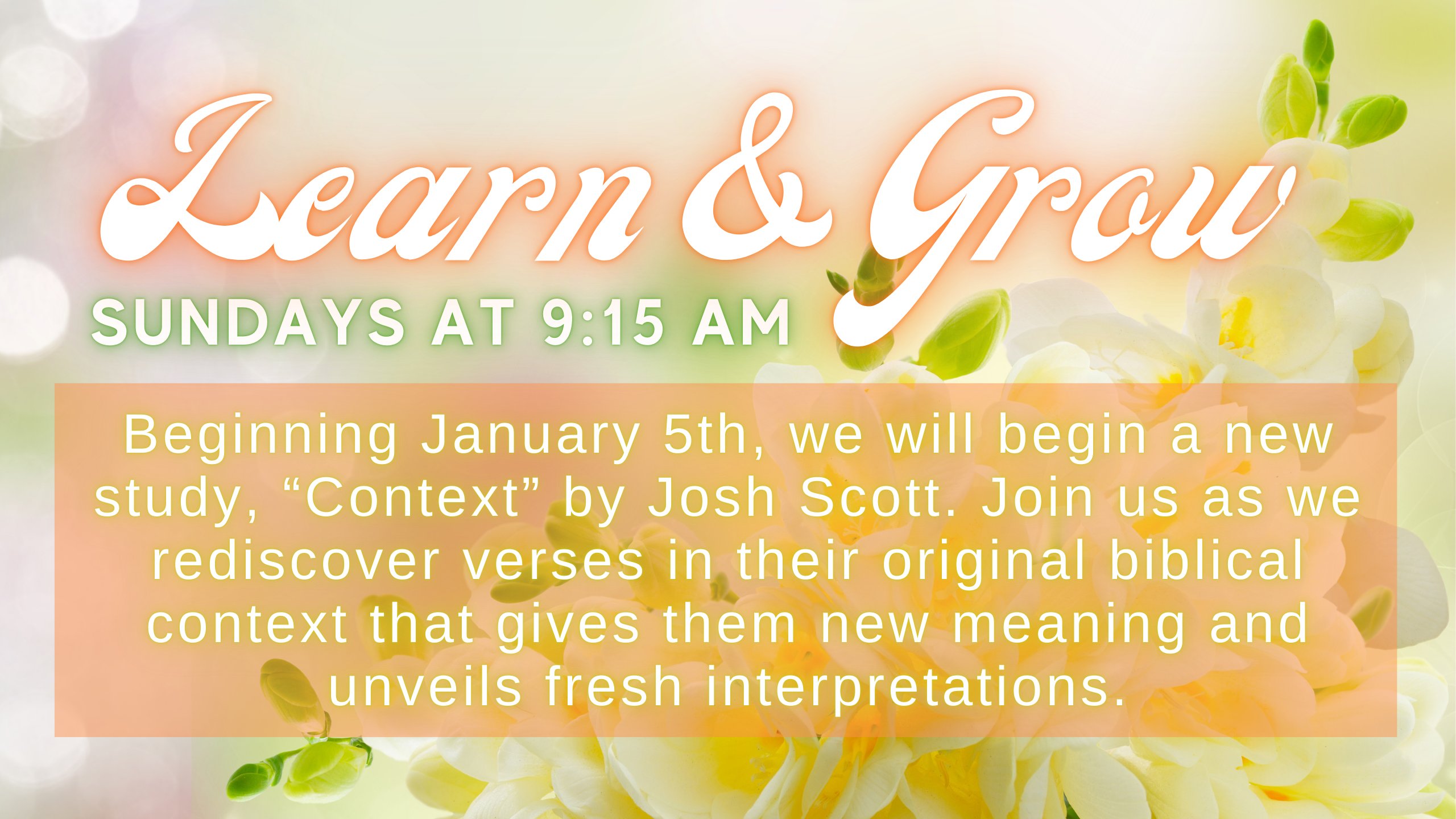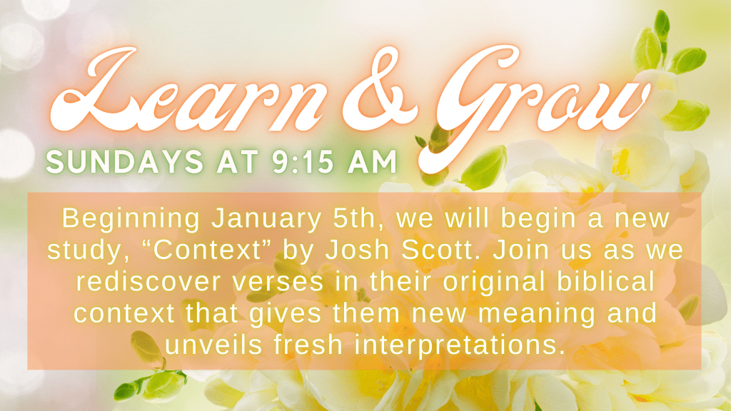 Our Learn & Grow class returns in the new year with a new study by Josh Scott called “Context: Putting Scripture in its Place”. Join us as we rediscover scripture readings and explore their meanings by examining them in their original biblical context. This study looks at verses we know by heart but may not know the people, places, and times that give them meaning. Through this process, we will unveil fresh and enlightening interpretations that are often missed when these Scriptures are taken out of context. Join us Sunday mornings at 9:15 for Learn & Grow!