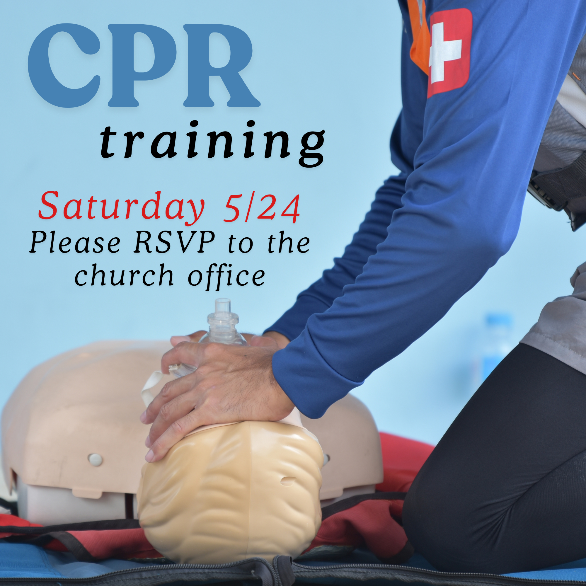 We are holding a CPR training class Sat. 5/24 at 1 pm. The CPR & First Aid Anywhere class will help you learn the lifesaving skills of adult and child CPR, how to use an AED, and how to help an adult or a child during choking-related emergencies. It also covers basic first aid skills to help a victim in the first few minutes before EMS arrives. Please note: successful completion of CPR & First Aid Anywhere training does not result in an AHA course completion card. You will gain valuable knowledge and hands-on practice. Please contact the church office to reserve your spot in this class, as space is limited! The cost is $35 (scholarships available). Thank you!