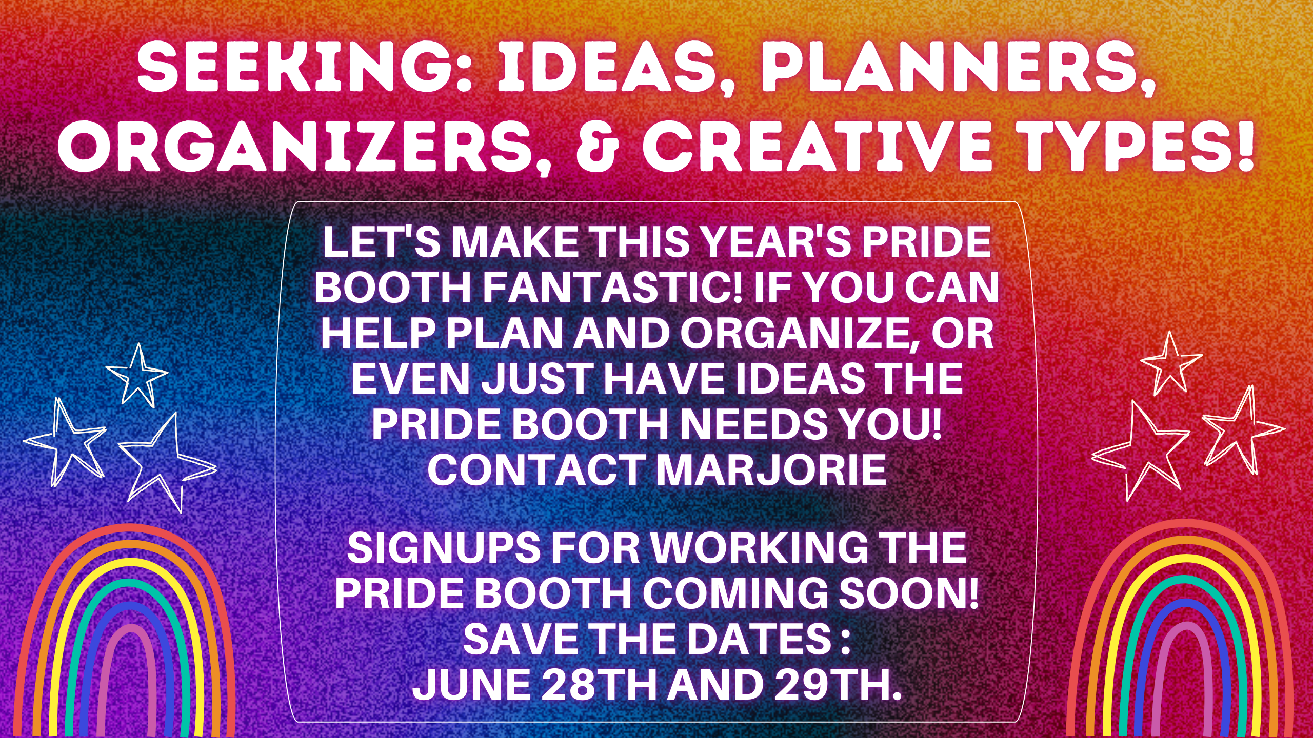 Seeking: Ideas, planners, organizers, and creative types! Let’s make this year’s Pride booth fantastic! If you can help plan and organize, or even just have ideas, the Pride booth needs you! Contact the church office. Plus, signups for working the Pride Booth coming soon! Save the dates: June 28th and 29th.