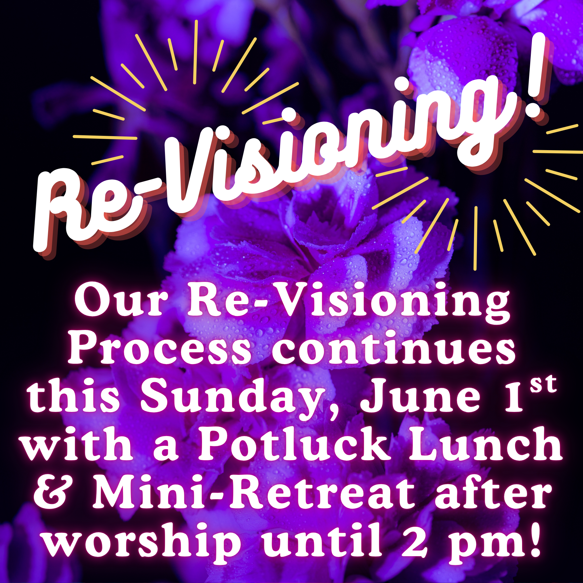Thanks to everyone who participated in our small group conversations! The leaders of the small groups are compiling a report to be presented to the congregation in a mini-retreat this Sunday, June 1st following worship. Join us for a potluck and large group meeting that will include big group discussions, brainstorming, and could include breaking off into small groups. The session this Sunday will be over no later than 2 pm. Thank you for your prayerful participation in this sacred work!
